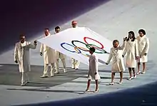 The Sretensky Monastery men's choir sang the Russian National Anthem, while 240 volunteers stood in formation wearing glowing suits of white, red, and blue to represent the Russian flag.[11][12] The Russian flag bearers were a detachment of cosmonauts — Fyodor Yurchikhin (who returned from space with the torch), Roman Romanenko, Svetlana Savitskaya and Yelena Serova – and the flag was raised by Sergei Krikalev.[13] The volunteers moved up and down to create a waving flag motion.[11][12]