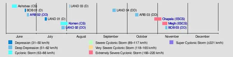 The season started rather late compared to the last two years, with the first storm, Ashobaa, not developing until June 7. Ashobaa was followed by 2 depressions, before Komen formed in July. Komen produced torrential rainfall in Bangladesh. September featured no storms, before Chapala formed at the end of October. Chapala rapidly intensified over the Arabian Sea into an Extremely Severe Cyclonic Storm, becoming the strongest in the Arabian Sea since Gonu in 2007. Chapala also became the only hurricane force system to make landfall in Yemen, and the first since 1922 in Socotra. Chapala was followed by Megh, which reached a weaker intensity in the same general area.