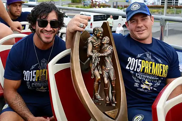 The 2015 North Queensland Cowboys season was the 21st in the club's history. Coached by Paul Green and co-captained by Johnathan Thurston and Matthew Scott, they competed in the NRL's 2015 Telstra Premiership. The Cowboys celebrated 20 years as a club in 2015 and played in the first all-Queensland grand final, defeating the Brisbane Broncos 17–16 in golden point to win their first premiership.