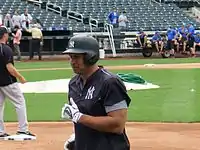 On May 9, closer Aroldis Chapman made his Yankees debut, pitching one inning and allowing one earned run on two hits.[19] The vaunted bullpen trio of Dellin Betances, Andrew Miller and Chapman became known in the media as "No-Runs DMC", a nod to the Queens hip-hop group Run–D.M.C.[20] On May 16, Carlos Beltrán recorded his 400th career home run.[21] On May 29, the Yankees beat the Rays 2-1 with only one hit, a Starlin Castro 2-run home run, the first time the Yankees won with only hit since 1914.[22]