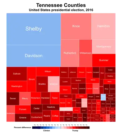 Trump won the election in the Volunteer State with 60.7% of the vote. Clinton received 34.7% of the vote.[2] This is the largest margin of victory for a presidential candidate for either party in the state since 1972 with Richard Nixon, and also the first time since that either party has earned over 60% of the vote in Tennessee. Tennessee was one of eleven states won by Bill Clinton in 1992 and 1996 but lost by Hillary Clinton.