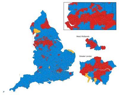 The Conservatives retained a majority of seats in England, though with a net loss of 23 seats. They also increased their share of the vote to their highest since 1987.
