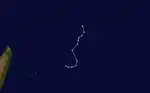 The origin of Calvinia can be traced back to an area of persistent showers and thunderstorms southwest of Diego Garcia first noted by the JTWC on 16 December. The system featured a loosely-defined circulation upon designation, but computer models indicated that tropical cyclogenesis intermediately was unlikely.[64] The storm complex drifted southward over the next two days,[65] and an increase in organisation briefly prompted the issuance of a Tropical Cyclone Formation Alert (TCFA) on 18 December before an increase in wind shear cut development of the system short, leading to alert's cancellation despite the system producing storm-force winds.[66][67] The system then slowly curved to the west towards Madagascar,[68][69] eventually moving into a much more favorable environment enhanced by a passing Kelvin wave by 25 December.[70][71] Two days later, MFR designated the system as a Zone of Disturbed Weather;[72] the disturbance was initially broad and had two areas of rotation.[73] The next day, MFR upgraded the system to a Tropical Depression while the JTWC issued a second TCFA.[72][74] Tracking southward, the depression strengthened and became a Moderate Tropical Storm on 29 December, gaining the name Calvinia.[75][76]