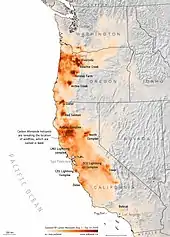 The Western United States experienced a series of major wildfires in 2020. Severe August thunderstorms ignited numerous wildfires across California, Oregon, and Washington, followed in early September by additional ignitions across the West Coast. Fanned by strong, gusty winds and fueled by hot, dry terrains, many of the fires exploded and coalesced into record-breaking megafires,[7] burning more than 10.2 million acres (41,000 square kilometres) of land,[2][3] mobilizing tens of thousands of firefighters, razing over ten thousand buildings,[3] and killing at least 37 people.[8][9] The fires caused over $19.884 billion (2020 USD) in damages,[2][3] including $16.5 billion in property damage and $3.384 billion in fire suppression costs.[2][3] Climate change and poor forest management practices contributed to the severity of the wildfires.[10]