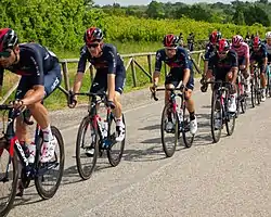 ![]() Ineos Grenadiers leading the peloton on Stage 15 of the Giro d'Italia with Egan Bernal wearing the maglia rosa | |