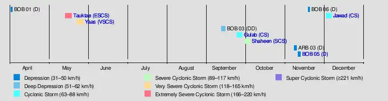 No systems formed in the basin until April 2, when a depression near the Myanmar coast in the North Andaman Sea formed, however it dissipated the next day. It was considered rare since the storm formation usually begins from mid-April to May. After a month of inactivity, another depression formed off the coasts of Kerala and Lakshadweep. It intensified into a deep depression on the same day and later into a cyclonic storm, being assigned the name Tauktae by the IMD. It continued intensifying, and on May 17, Tauktae peaked as an extremely severe cyclonic storm before making landfall in Gujarat hours later, dissipating on May 19. A few days after Tauktae dissipated, a depression formed in the Bay of Bengal on May 23. It intensified gradually to a cyclonic storm and assigned the name Yaas. It further intensified into a very severe cyclonic storm on May 25 and made landfall in the state of Odisha by the next day, becoming the second cyclone to hit the nation within a span of ten days. After a long gap of three and a half months, a depression formed in the Bay of Bengal on September 12, becoming the first system in the monsoon season. Not a week later, another depression formed over the east-central Bay of Bengal, making the second system in the post-monsoon season. It later intensified into a deep depression and on 25 September 2021, it intensified into cyclonic storm which was named Gulab, marking the first named storm in the post-monsoon season. Then, after only two days, the remnants of Cyclonic Storm Gulab entered the Arabian sea and regenerated into a Depression and became ARB 02. ARB 02 intensified into a cyclonic storm and was named Shaheen by the IMD. After an unusual month of inactivity, Depression ARB 03 formed in early November and remained out to sea. A couple of days later, Depression BOB 05 formed in the Bay of Bengal but failed to further intensify due to high wind shear. BOB 05 impacted portions of southern India with flooding, and some areas experienced cyclonic storm sustained winds. A few days later, Depression BOB 06 formed which gave additional rainfall and damages to the same places in southern India which were affected by BOB 05 earlier with the worst damages being in Rayalaseema region of Andhra Pradesh. In the month of December, a low pressure area entered into the Andaman Sea from the West Pacific Ocean and it intensified gradually into a cyclonic storm named as Jawad. Initially expected to make landfall over Odisha but due to extremely high wind shear, it weakened rapidly into a low pressure area without making a landfall.