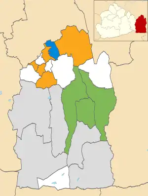 Map of the results of the 2022 Tandridge District Council election. Independents in grey, Liberal Democrats in yellow, Oxted & Limpsfield Residents in green and Conservatives in blue. Wards in white were not contested in 2022.[1]