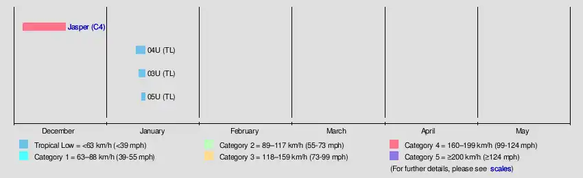 The season officially started on 1 November, however the first system, Cyclone Jasper, was not active until 4 December, when it crossed into the basin as a tropical low from the South Pacific. The low became a named storm on 5 December, receiving the name Jasper,[5] and intensified into the season's first severe tropical cyclone the next day.[6] Jasper made landfall in Far North Queensland as a Category 2 tropical cyclone on 13 December.[7] After a significant lull in activity, Tropical Lows 04U and 03U formed on January 10 and 11 respectively.[8][9] Tropical Low 05U formed on 12 January.