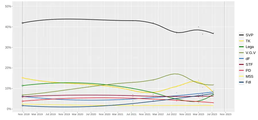 | Date | Polling firm | Sample size | SVP | TK | Lega | V-G-V | dF | STF | PD | M5S | FdI | FI | Enzian | FSmW | JWA | Vita | Others | Lead |
