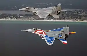 A MiG-29 of Jagdgeschwader 73 in formation with an F-15C Eagle from the 28th Test Squadron[note 1]