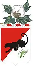 • Symbolism: Scarlet and white (silver) represent the Cavalry branch. The panther embodies the qualities emphasized by the motto, "Swift and Unseen." Black denotes strength and solidarity. The paws and claws terminating the motto scroll symbolize tenacity and a readiness to fight. The green of the scroll and shrub on the shield signify growth and the land which is a traditional cavalry environment. Scarlet also denotes courage and sacrifice.