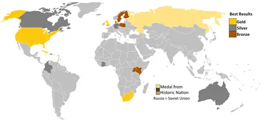 The United States is the most successful nation in the event, with 21 gold medals and 44 medals in total. The next most successful nation is Great Britain. The 1908 men's 400 metres saw the only walkover in Olympic history, as the American finalists refused to compete in the final in protest of the officiating.[1]