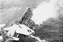 The Mark 42 5"/54 caliber gun (127mm) is a naval gun (naval artillery) mount used by the United States Navy and other countries. It consisted of the Mark 18 gun and Mark 42 gun mount. United States naval gun terminology indicates the gun fires a projectile 5 inches (127.0 mm) in diameter, and the barrel is 54 calibers long (barrel length is 5" × 54 = 270" or 6.9 meters.)[1] In the 1950s a gun with more range and a faster rate of fire than the 5"/38 caliber gun used in World War II was needed, therefore, the gun was created concurrently with the 3"/70 Mark 26 gun for different usages. The 5"/54 Mk 42 is an automatic, dual-purpose (air / surface target) gun mount. It is usually controlled remotely from the Mk 68 Gun Fire Control System, or locally from the mount at the One Man Control (OMC) station.[2]