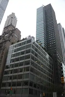The original structure is surrounded by a plaza with granite pavement, which reaches the curb on both Park Avenue and 59th Street. The plaza is at sidewalk level on Park Avenue and is four steps higher than the western end of the site on 59th Street, giving the impression that the plaza is a podium.[19][20] The plaza's pavement dates from the 1980s when 500 Park Tower was built.[24][18] The granite plaza extends in front of 500 Park Tower.[24] The eastern end of the plaza contains a stainless steel cube.[18] At the western end of the plaza is a flagpole atop a granite bulkhead, as well as a metal canopy extending to the 59th Street sidewalk.[19]