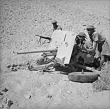 Although the majority of the New Zealand Division would take part in the Battle of Crete, 7th Anti-Tank Regiment was evacuated to Egypt prior to the battle.[18] In Egypt the regiment acquired new 2-pounder gun portées (previously only 34 Battery had portées) and was brought up to strength with reinforcements. A fourth troop was also added to each battery,[Note 2] but, unlike the first three troops, were instead equipped with 18-pounder guns converted to be used in the anti-tank role.[19] In September 1941 the New Zealand Division took over the Baggush Box, a defensive position on the Libyan coast. Training would nonetheless continue until November in anticipation of an offensive against the Germans and Italians in Libya.[20]