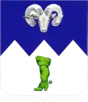 - Shield- Per fess dancetté Azure and Argent, in chief a ram’s head affronté of the second and in base a jack boot Vert.