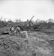 Guards Armoured Division landed in Normandy between 25 and 30 June.[8] Its first action was Operation Goodwood on 18 July, in which VIII Corps' three armoured divisions would secretly cross to the east side of the River Orne and then thrust southwards past Caen deep into German-held territory. The Guards were the second division in the column, but the advance ran out of impetus once the tanks had passed out of range of the supporting artillery, which was still west of the river because of congestion in the bridgehead. That night the Luftwaffe made one of its rare air raids, hitting the Orne bridgehead and causing damage among the rear echelons of the armoured divisions. The few German air sorties made next day while the British consolidated were ineffective.[8][16][17][18] It was during that afternoon (19 July) that the regiment scored its first 'kill' when a formation attempted to attack 32nd Guards Brigade HQ: 324 LAA Bty 'sent one crashing down in flames and the rest made off hurriedly, two of them smoking and losing height. During the next two days two more aircraft definitely fell to the regiment and three more were damaged'.[19]