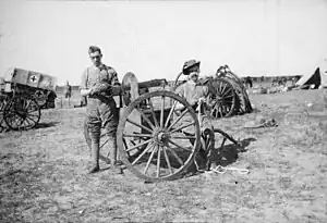 The two Montgomeryshire companies mobilised at Welshpool on 4 January 1900 and began training at Welshpool and Newtown respectively. For advanced training the two companies moved to Wynnstay, the country estate of Sir Watkin Williams-Wynn, 7th Baronet, the Montgomeryshire Yeomanry's commanding officer, whose younger brother Captain Robert Williams-Wynn commanded the 31st Company. They were joined by a section of two Colt machine-guns on 'galloping carriages' that had been provided by public subscription. The 29th Company sailed first for Cape Town and arrived on 5 March. The other three companies embarked on the Elder Dempster Lines' SS Montrose at Liverpool on 13 March and landed on 8 April.[3][6][11]