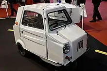 The Mini-Comtesse was the smallest car produced. It was a single seater three wheeler with two training wheels at the front to improve stability. To comply with the initial "L-category" regulations the car had a pedal which could technically speaking be used to propel the vehicle. Pushing down on the pedal would propel the car about one foot forward, thus meeting the letter of the law.[1] The car had a conventional door on one side and folding gull wing door on the other to allow it to park in extremely confined spaces. The car was front-engine, front-wheel drive by a Sachs air-cooled 49 cc single cylinder, 2-stroke, 3 hp engine connected by a centrifugal clutch to a two speed gearbox with no reverse gear. It had a top speed of 20 mph.[1] Production of the Mini-Comtesse ended in 1979.[2] Paul Clement-Colin says they were powered by a Saxonette 47 cc or Motobécane 50 cc engine.[2]