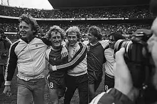 AZ celebrated their first-ever Eredivisie title with a 5–1 away victory over Feyenoord on 3 May 1981. This win secured their spot in the 1981–82 European Cup. The photo features left-back Hugo Hovenkamp (left, in tracksuit) and forward Kees Kist (centre, number 9).