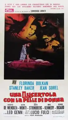 A Lizard in a Woman's Skin (Italian: Una lucertola con la pelle di donna) is a 1971 giallo film directed by Lucio Fulci and produced by Edmondo Amati and Robert Dorfmann. It stars Florinda Bolkan, Stanley Baker, Jean Sorel, Leo Genn, and Anita Strindberg. The film was an Italian-Spanish-French co-production.