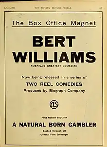 A Natural Born Gambler is a 1916 silent film short, the first of only two films starring Broadway comic and singer Bert Williams. The film was Williams' first two-reel comedy, and was a film that was expected not to disappoint audiences and was highly anticipated.[1] It was produced by the Biograph Company and released by The General Film Company. Williams directed and G. W. Bitzer, also known as Billy Bitzer, who was usually D. W. Griffith's cameraman, was the cinematographer. This is a still-surviving film, featuring Williams in his famous blackface routine.[2] It is an authentic comedic film for its time (1916) in which Williams is still humorous without heavily relying on the popular physical style of slapstick comedy. Special and strategic advertising along with the name Williams had created for himself made it possible for the film to get exposure throughout the country. Most of this exposure came from newspaper prints.