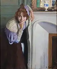 Following Rusiñol's return to Spain, Satie and Nantas stayed in touch; seven years later he dedicated his waltz for piano Poudre d'or (Gold Dust, 1901) to her. From 1896 she was the companion of Italian painter Egisto Paulo Fabbri. At the wedding of painter Alfredo Müller on February 5, 1908, Satie and Nantas were among the witnesses and signed the marriage certificate side by side.[7] Fabbri's 1910 Portrait of Stéphanie shows her still striking but visibly afflicted by the tuberculosis that darkened her last years. She died in 1913.[8]
