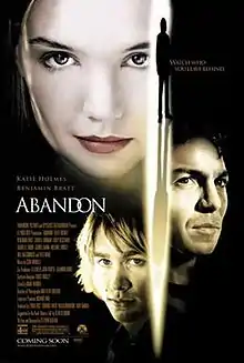 Abandon is a 2002 American psychological thriller drama film written and directed by Stephen Gaghan in his directorial debut. It stars Katie Holmes as a college student whose boyfriend (Charlie Hunnam) disappeared two years previously. Despite being set at an American university, much of the movie was filmed in Canada at McGill University's McConnell Hall. It is based on the book Adams Fall by Sean Desmond. The book was re-titled[3] Abandon for the movie tie-in paperback printing. The film co-stars Zooey Deschanel, Gabrielle Union and Melanie Lynskey, with Benjamin Bratt playing the detective investigating the boyfriend's disappearance. It received generally negative reviews.