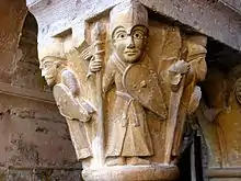 There are 212 columns in Conques with decorated capitals. The capitals are decorated with a variety of motifs including palm leaves, symbols, biblical monsters and scenes from the life of Sainte-Foy.[2] On the fifth capital of the north side of the nave are two intricate and expressive birds. On the corresponding capital on the south side of the nave are flat and lifeless human figures. The figures appear to have a slight hunch, as if they are reacting to the weight of the arches above them.[5] The capitals functioned as didactic picture books for both monks and pilgrims.[4] Traces of color are still visible on a number of the columns.[6]