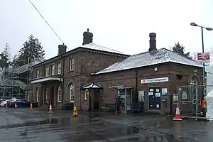The station, designed by Charles Liddell, Chief Engineer of the Newport, Abergavenny and Hereford Railway (NA&HR), is in an Italianate architecture style[2] in a local pink semi-ashlar sandstone[3] with natural slate roofs and stone stacks. The down platform building is stone with a timber-framed front and a natural slate roof.[1] The footbridge comprises cast iron columns of typical GWR design which support the stairways and the two spans. The span over the now removed by-pass freight lines is the wrought iron lattice girder original but the main span over the running tracks was replaced by a steel plate-girder in the late 20th century.