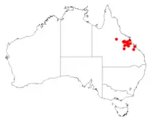 It is endemic to central eastern Queensland where it is found in the upper portion on the Isaac River watershed and adjacent parts of the Belyando River catchment where it usually situated on floodplains and riverbanks growing in sandy soils as a part of open Eucalyptus woodland communities and is mostly associated with Eucalyptus crebra.[1]