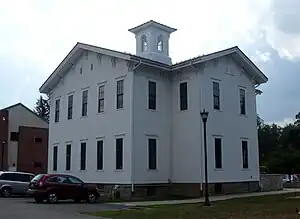 Academy Hall is a two-story, Italianate-style structure located at the intersection of High and Normal Streets at Edinboro University of Pennsylvania, southeast of downtown Edinboro. The hall is 40 by 50 feet (10 m × 20 m) with 10 by 24 feet (3 m × 7 m) wings containing stairwells on the north and south sides.[2] A cupola with a low, pyramidal roof and arched windows is perched atop the building. Beneath the brackets and dentil on the cupola is a "Greek key fretwork".[2] The exterior of Academy Hall has remained unaltered since its construction, other than a new basement and foundation when it was moved in 1880, and the removal of chimneys in 1885.[5] During renovations in 2006 and 2007, parts of the first floor ceiling were removed and a mezzanine installed. The cupola also functions as a skylight.[6]
