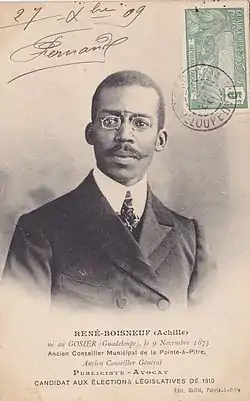 Achille was born son of Hyacinthe Boisneuf, a well to do freed slave, and a farm worker, Amanda Mathurine René, then adopted by Boisneuf and his wife and put through school.[2] Achille René-Boisneuf was mayor of Pointe-à-Pitre 1911–1922, President of the Conseil Général of Guadeloupe 1912–1922, then one of Guadeloupe's deputies in Paris 1914–1924.