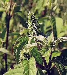A. japonica is a perennial plant growing to 50–100 cm (20–39 in) tall with thickened roots. Stems are glabrous or slightly pubescent and shape quadrangular and branched.[2] Its nodes are dilated. The leaves opposite and shape elliptic or oval and slightly pubescent and have petiolate. The leaves are 10–20 cm (3.9–7.9 in) long and 4–10 cm (1.6–3.9 in) wide. Flowers bloom from August to September and inflorescence spikes in axils and at terminals of the stem. From there, tiny green flowers bloom. It has five stamens and a pistil in each flower and unites into one at the bottom. Tiny bracts, branch shaped, easily stick to cloth.