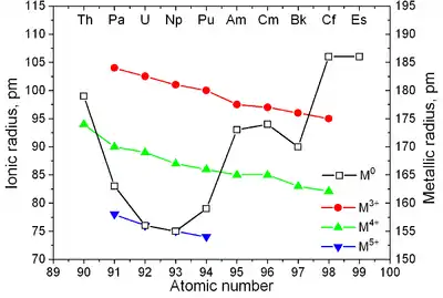 All the actinides are f-block elements. Lawrencium is sometimes considered one as well, despite being a d-block element[5][6] and a transition metal.[7] The series mostly corresponds to the filling of the 5f electron shell, although as isolated atoms in the ground state many have anomalous configurations involving the filling of the 6d shell due to interelectronic repulsion. In comparison with the lanthanides, also mostly f-block elements, the actinides show much more variable valence. They all have very large atomic and ionic radii and exhibit an unusually large range of physical properties. While actinium and the late actinides (from curium onwards) behave similarly to the lanthanides, the elements thorium, protactinium, and uranium are much more similar to transition metals in their chemistry, with neptunium, plutonium, and americium occupying an intermediate position.