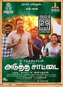 Adutha Saattai (transl. Next whip) is a 2019 Indian Tamil-language action drama film which is a sequel to Saattai (2012), written and directed by M. Anbazhagan. The film is the third installment in the Saattai franchise. It stars Samuthirakani and Thambi Ramaiah with Athulya Ravi, debutant Kaushik Sundaram, and Yuvan in supporting roles. D. Imman who previously composed music for the prequel is replaced by Justin Prabhakaran. Principal photography of the film began on 12 December 2018.[1]
