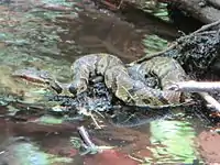 The eastern cottonmouth (Agkistrodon piscivorus piscivorus)[4][5] was once classified as a subspecies of the cottonmouth (Agkistrodon piscivorus). However, DNA based studies published in 2008 and 2015, revealed no significant genetic difference between the eastern cottonmouth (Agkistrodon piscivorus piscivorus) and the western cottonmouth (Agkistrodon piscivorus leucostoma) and synonymized the two subspecies (with the oldest published name, A. piscivorus, having priority). The resulting taxonomy does not recognizes the eastern cottonmouth (A. p. piscivorus) as a valid taxon.[7][8] Several subsequent reviews and species accounts have followed and supported the revised taxonomy.[9][10]: 437 p. [11] Information on this snake can be found in the Agkistrodon piscivorus article.