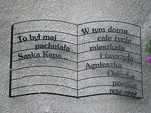 {{cite web}}: CS1 maint: multiple names: authors list (link) - ↑ "Agnieszka Osiecka (1936-1997) - Find A Grave..." www.findagrave.com. Retrieved 2018-03-23.