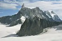 The Aiguilles Marbrées (3,535 metres (11,598 ft)), (French pronunciation: [eɡɥijmaʁbʁe], literally "marbled needles") is a mountain peak in the Mont Blanc massif, above the Glacier du Géant, with its summits forming part of the frontier between France and Italy. It is situated between the Col de Rochefort and the Col du Géant, and is easily accessed from the Torino Hut at Pointe Helbronner.