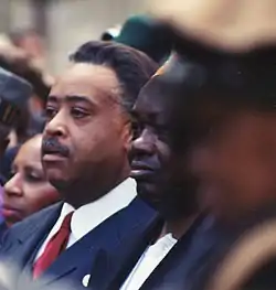 Al Sharpton was born in New York City in 1954. At an early age, he took an interest in religion and was ordained as a Pentecostal minister at the age of 10.[1] In his teenage years, he became involved in politics and activism, and in 1969, he was named the youth director for Operation Breadbasket by civil rights activist Jesse Jackson. In 1972, Sharpton served as the youth director for Shirley Chisholm's 1972 presidential campaign and that same decade he formed the National Youth Movement.[2] Throughout the 1980s, Sharpton became more well known for organizing protests on various issues, and in 1987, he reached national attention for advocating in support of Tawana Brawley, a woman who alleged that six white police officers had raped her. A grand jury later ruled the allegations a hoax and Sharpton was later charged with defamation of an assistant district attorney who had been involved in the case.[1][3] In 1991, Sharpton founded the civil rights organization the National Action Network (NAN).[2]