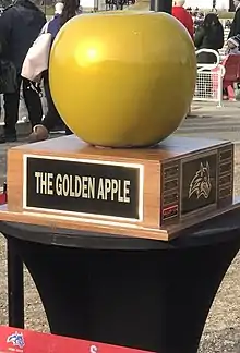 The Albany–Stony Brook football rivalry, also known as the Battle for the Golden Apple[1][2][3] and the Empire Clash[4][5] is an American college football rivalry between the Albany Great Danes and the Stony Brook Seawolves. Both teams represent university centers of the State University of New York, and since 2013 have competed together as members of CAA Football, the legally separate football league operated by the multi-sports Colonial Athletic Association (CAA).[6][7][8][9] The two teams have met 25 times on the football field, with Albany currently holding a 15–10 edge in the all-time series. Albany leads the series 12–9 since 1999, when both programs moved up to Division I.