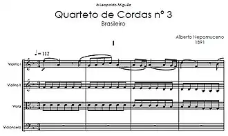 Among his prominent works is his String Quartet No. 3 "Brasileiro" (Brazilian). According to Nepomuceno's handwritten note, it was composed in Berlin in 1890. It is probably the earliest example of the integration of Brazilian folk melody with the Central European romantic idiom. The "Brasileiro" String Quartet remained unpublished until 2005, and was only rarely performed before then.
