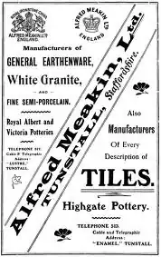 1. 1 2 "Alfred Meakin (Tunstall) (Ltd)". www.thepotteries.org. Retrieved 2023-11-06.