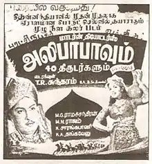Alibabavum 40 Thirudargalum was released on 14 January 1956,[58] during the festive occasion of Pongal,[59] delayed from a 12 January release.[60] Historian V. Sriram believes it was the first Tamil film to take advantage of block colour advertising.[61] The film was a commercial success and ran for over 100 days in theatres.[62] Tamil film historian S. Theodore Baskaran wrote in his 1996 book The Eye of the Serpent, "The film's cast of M.G. Ramachandran as the swash-buckling Alibaba, Bhanumathi as the singing-heroine ... and Thangavelu as the comedian was the main factor contributing to its huge success." He said another factor attributed to the film's success that it was the first full-length South Indian colour film.[63] Sachi Sri Kantha felt that the Gevacolor looked somewhat "washed out" and "inferior" to other colouring processes like Eastmancolor and versions of Fujicolor. He said the film succeeded with the Tamil masses because "it was a first time experience they could enjoy the [colour] in totality. This is because illiterate Tamil masses would have watched Hollywood movies produced in [colour] for entertainment. But, being illiterate, [the] majority wouldn't have comprehended the dialogues and songs in English."[11] It won the Film Fans' Association Award for Best Tamil Film.[64][65] The film was later dubbed in Telugu as Ali Baba 40 Dongalu.[66][67] Alibabavum 40 Thirudargalum had a limited re-release on 14 April 2011, during the festive occasion of Puthandu (Tamil New Year) in Chennai.[68] The film was released on home video by Moser Baer in June 2010,[69] and by Raj Video Vision in April 2012.[70]
