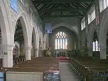 The church's four-bay arcades have octagonal piers. The church is stone-tiled, the chancel has mosaic tiles and the walls are exposed stone. The church has an undecorated medieval tub font on a 19th-century pedestal. The pulpit dates from 1889 and of a square wooden form with centre panels with depictions of Jesus and the disciples.[1]