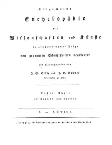 It was designed and begun in 1813 by Professor Ersch to satisfy the wants of Germans, only in part supplied by foreign works. It was stopped by the Napoleonic Wars until 1816, when Professor Gottlieb Hufeland joined, but he died on November 25, 1817, while the specimen part was at press. The first volume appeared in Leipzig in 1818. The editors of the different sections at various times were some of the best-known men of learning in Germany, including Gruber, M.H.E. Meier, Hermann Brockhaus, W. Müller and A.G. Hoffmann of Jena. Naturalist Eduard Poeppig wrote most of the articles on the Americas.[1] All articles bear the authors' names, and those not ready in time were placed at the end of their letter.[2]
