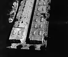 A US Navy salvage party and a detachment of the 1051st Engineer Port Construction and Repair Group arrived on 1 September.[81] The 1051st was a specialized formation that had previously handled the rehabilitation of the ports of Palermo and Naples.[83] The divers of the 1051st discovered that the port and berth entrances had been blocked by 33 ships. Some 65 ships had been scuttled in the harbor channels in a criss-cross arrangement, sometimes in two or three layers. Seven large ocean-going ships had been sunk in a heap at the harbor mouth to block it. The pattern of scuttling and demolition was designed to preclude the laying of piers over sunken ships, as had been done in Naples.[80][81]