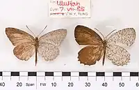 Female. Similar, but in all specimens I have seen invariably smaller. Underside: ground colour of the same brown shade as in the male, the pale postcellular patch on forewing replaced by a diffuse medial patch that spreads into the cell. Hindwing: as in the male. Underside: also similar in ground colour and markings to that of the male, but the markings broader, more clearly defined, and less macular. Antenna, head, thorax and abdomen as in the male.[5]