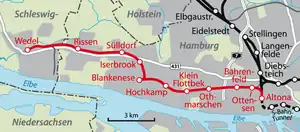 The Altona–Blankenese railway is a railway line to the west of Hamburg. It starts at the Altona station and runs through Othmarschen to Blankenese station. This section of line was opened in 1867. 16 years later the line was extended to Wedel. It is now used by lines S1 and S11 of the Hamburg S-Bahn and was part of the first electrified suburban railway in Germany.