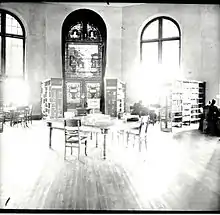 The library once held 49,000 volumes, and the public was invited to use and visit the library. They worked under an open-shelf system, which means that most of the library's collection is open and freely accessible. The books were housed in fire-resistant rooms.[1]